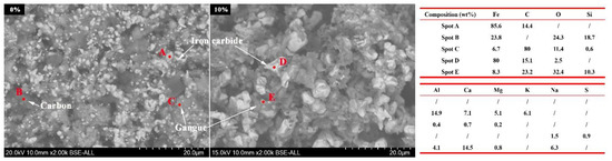 Figure 15 shows the SEM images of the magnetic concentrate and acid leaching concentrate, and the EDS results are listed in Table 2. It is clearly found that the magnetic concentrate was very fine and the particle size was mostly less than 10 μm. Owing the fine grinding, these fine iron carbides and gangue were strongly liberated. However, there was still a small amount of large iron carbide particles (particle a). These iron carbides and gangue cannot be liberated, and they remained interconnected. In addition, fine iron carbide and gangue particles can easily reunite during the magnetic separation process, which led to a smaller number of fine gangue particles (particle b) remaining in the magnetic concentrate. From Table 2 and Figure 14, the gangue particles were fine carbon particles or mixed particles of carbon, Na2Si3O7, and Na1.65Al1.65Si0.35O4. Therefore, it can be concluded that the separation efficiency of iron carbide and gangue was good and the separation efficiency of iron carbide and gangue may be further increase if the magnetic separation process continues to be optimized.