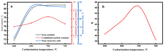 Figure 7a shows the effect of the carburization temperature on the magnetic concentrate. The iron content, combined carbon content, and iron recovery rate of magnetic concentrate increased with the rise in carburization temperature, whereas the combined carbon and iron recovery rate slightly decreased when the carburization temperature was over 700 °C. Iguchi et al. [25] have verified that the carburization of iron ore is controlled by chemical reaction at the temperature of 500 to 750 °C. Therefore, a high temperature significantly improved the carburization rate, thus the carburization index significantly increased at the temperature from 600 to 700 °C (Figure 7b). From Figure 8, it is observed that the diffraction peak intensity of iron carbide increased with the increasing carburization temperature. A high iron carbide content improved the separation of iron carbide and gangue.