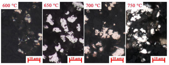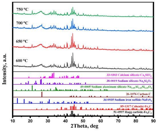 A previous study [21] proved that a high temperature improved the sodium modification reactions. As shown in Figure 8, the diffraction peak intensity of Na2Si3O7, Na1.65Al1.65Si0.35O4, and Ca2SiO4 increased with the increase in carburization temperature. These high gangues contents enhanced the embedded relationship of iron carbide and gangue. Figure 9 shows that the iron carbide particle size increased with the increasing carburization temperature, which can improve the separation of iron carbide and gangue. Therefore, the high iron carbide content, large iron carbide particle, and good embedded relationship of iron carbide and gangue significantly enhanced the separation of iron carbide and gangue. When the carburization temperature increased from 600 °C to 700 °C, the iron content, combined carbon content, and iron recovery rate of magnetic concentrate increased from 72.87%, 7.07%, and 68.79%, respectively, to 80.79%, 8.26%, and 87.64%, respectively.