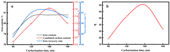 When the carburization time was over 150 min, the iron carbide decomposed, which led to the low carburization index (Figure 10b), which indicated the low iron carbide content. However, the size of iron carbide particles continued to increase. Thus, the combined carbon content and the recovery rate of magnetic concentrate decreased and the iron content of magnetic concentrate slightly increased.