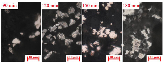 Figure 10a shows the effect of carburization time on the magnetic concentrate. The iron content, combined carbon content, and iron recovery rate of magnetic concentrate increased with the increase in the carburization time, whereas the combined carbon and iron recovery rate decreased when the carburization time was over 150 min. With the increase in carburization time, the carburization index increased (Figure 10b). A high carburization index shows a high iron carbide content. As show in Figure 11, the iron carbide particle size increased with the increasing carburization time. A high iron carbide content and large iron carbide particle improved the separation efficiency of iron carbide and gangue.