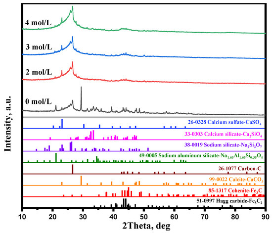 It is found from Figure 13 that the gangues, such as CaCO3, Ca2SiO4, CaSO4, Na2Si3O7, and Na1.65Al1.65Si0.35O4, were produced during the carburization process. In addition to these gangues, a small amount of iron carbide remained in tailing. The XRD results of acid leaching concentrate show that the diffraction peak intensities of CaCO3, Na2Si3O7, Na1.65Al1.65Si0.35O4, Ca2SiO4, Fe3C, and Fe5C2 significantly decreased, whereas the diffraction peak intensities of C and CaSO4 increased, especially C. It is clearly found that CaCO3, Na2Si3O7, Na1.65Al1.65Si0.35O4, and Ca2SiO4 dissolved in the acetic acid, while free carbon and CaSO4 did not dissolve in the acetic acid. It is speculated that H+ reacts with CaCO3, Ca2SiO4, Na2Si3O7, and Na1.65Al1.65Si0.35O4 (Equations (9)–(12)) during the acid leaching process. The different solubility of these gangues and free carbon in acetic acid enhanced the separation efficiency of free carbon and gangue significantly. The carbon phase can be easily enriched by removing Ca, Si, Al, and Na in the form of sodium aluminosilicates, sodium silicate, dicalcium silicate, and calcium carbonate by acid leaching treatment. In addition, the XRD results of acid leaching concentrate show that the diffraction peak intensities of Fe3C and Fe5C2 dramatically decreased, which indicated that Fe3C and Fe5C2 also dissolved in the acetic acid (Equations (13) and (14)). The dissolution of these iron carbides also improved the free carbon content of acid leaching concentrate.