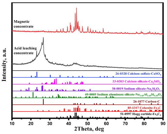 XRD patterns of the magnetic concentrate and acid leaching concentrate.