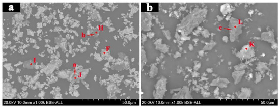 From Figure 15b, most gangue particles were also very fine. These fine gangue particles and fine carbon particles aggregated together (spot K). Abundant carbon particles were large (particle c). These large carbon particles were also mixed with some gangue (spot L). As shown in Figure 14 and Table 2, these gangues contained Ca2SiO4, CaSO4, Na2Si3O7, and Na1.65Al1.65Si0.35O4. Owing to the weak acidity of acetic acid, residual gangue in acid leaching concentrate was hard to further remove. Acid leaching teat with other acids should be carried out, if the separation efficiency of carbon and gangue is to be further enhanced.