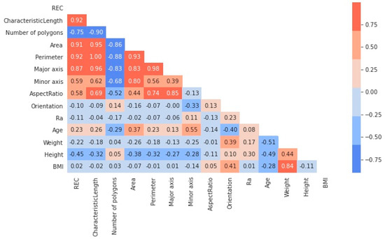 Then, several morphometric skin features such as the number of polygons per mm2 (NP) and, for each of them, their area (Ai), perimeter (Pi), orientation, minor (mi), and major (Mi), aspect ratio () were extracted. A characteristic length scale (Lc), averaging the sum of the equivalent diameter () and equivalent side () of the polygons, was also calculated.