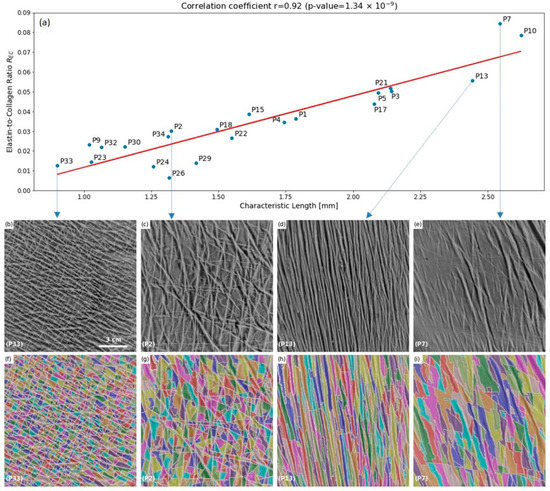 Figure 4 illustrates these four main types obtained from the optical images and their segmentation at different points on the curve between characteristic length and Elastin-to-Collagen ratio. This qualitative classification into four groups clearly reflects changes in the microstructure of the upper dermis, ranging from an isotropic distribution of tension lines for patients with the lowest characteristic length to a total loss of tension lines for patients with the highest characteristic length values.