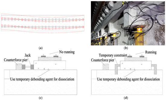 The overview diagram. (a) schematic diagram before and after the change in the route shape of the railway line; (b) an on-site view of the use of a jacking rectification fixing; (c) the cross section schematic diagram of the use of a jacking rectification fixing; (d) schematic diagram of the temporary constraint.