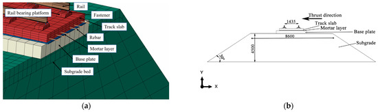 where is the shear stress, is the friction coefficient, which is taken as 3.3 according to the reference [27] and is the contact pressure on the contact surface. The longitudinal reinforcement is embedded in the track slab and the wide-narrow joint using the “Embedded” method. The contact between the mortar layer and the base plate is made using the “Tie” connection.