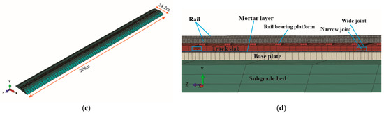 Abaqus software is used to establish a CRTS II slab ballastless track model for the subgrade section that matches the actual situation. The model consists of subgrade ballastless track, as shown in Figure 2a. The numerical model from top to bottom is rail, rail bearing platform, track slab, mortar layer, base plate and subgrade. According to references [24,25], the length of the whole model along the track direction is 208 m, a total of 32 plates are long (each plate is 6.5 m), the rail is connected with the rail platform through fasteners, and the track slabs are connected by the wide-narrow joint; the subgrade is trapezoidal, the height is 4.5 m, the top width is 8.6 m, the bottom width is 24.2 m and the slope is 30°, in which the longitudinal distance of the rail bearing platform along the line is 0.65 m. The cross-sectional dimensions are shown in Figure 2b. The overall size of the model is shown in Figure 2c, and the wide-narrow joint are distributed in the model as shown in Figure 2d.