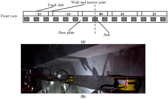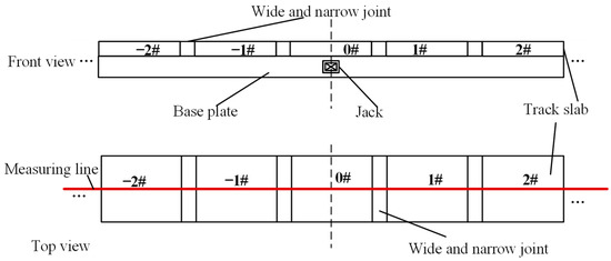 CRTS II slab ballastless track with high stability is one of the main forms of track structure used in China’s high-speed railways, which is widely used in high-speed railway main lines at home and abroad [1,2]. In the railway operation process, track alignment and line shape offset occurred due to complex geology, uneven foundation settlement and other factors caused by high-speed train, which may affect the operation and safety of traffic. Railway line offset in a small range can be rectified by adjusting the fasteners [3,4]. Due to a variety of reasons, the lateral displacement of the railway line during operation is greater than the allowable value of operation, and the longitudinal serpentine shape of the railway line or a long waveform that affects the safety of normal operation will appear. This paper intercepts a section of the line shape change of the railway line and draws a schematic diagram, as shown in Figure 1a. The black dotted line in the picture represents the standard position of the railway line, and the red solid line in the picture indicates that the railway alignment has a large lateral displacement deviation after a long period of operation. Figure 1b shows an on-site view of the use of a jacking rectification fixing to push the offset track slab to the previously designed position during the skylight period of train operation. After that, the line linearity should be restored and the smoothness must be ensured during train driving [4].