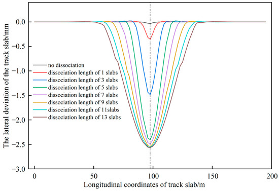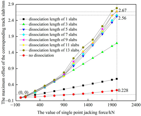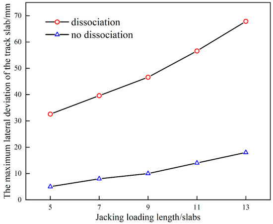 For multi-point jacking, a comparative analysis for the influence of dissociation is also carried out. The dissociation length is set to equal to the length of base plates which are pushed by jacks. The maximum lateral deviation of the track with and without dissociation at a jacking force of 400 kN is shown in Figure 8. The effect of dissociation on the deviation of the track during jacking rectification is significant; the maximum deviation is only 18.2 mm for a multi-point jacking with 400 kN jacking force without dissociation; and the maximum deviation increases with the increase of jacking loading length (Figure 7a) in the dissociation case, with a positive correlation between the jacking loading length and the maximum deviation of the track structure. With a jacking force of 400 kN and a jacking loading length of 13 slabs, the maximum deviation of the track structure can reach 67 mm, that means if the alignment (line shape) of the existing railway line needs to be corrected, a maximum of 67 mm in the lateral direction can be adjusted by this method under the above condition.