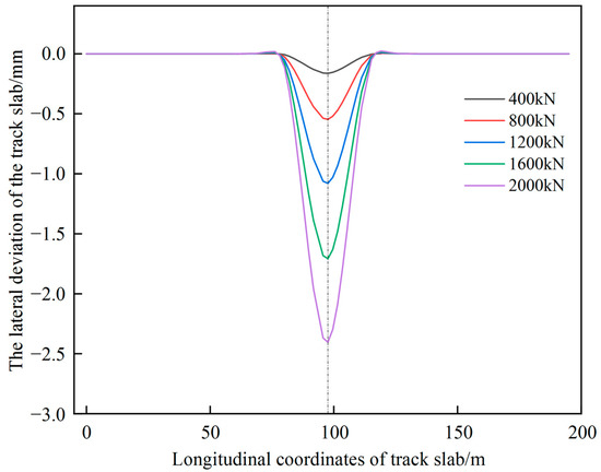 The lateral deviation curve of the track is shown in Figure 6 for a dissociation length of 5 slabs with different jacking forces. It can be seen that the increase of single point jacking force has a facilitating effect on the increase of lateral deviation, for every 400 kN increase of jacking force, the lateral deviation of the track increases by nearly 0.5 mm. Therefore, in the process of deviation correction of the railway line shape, when the deformation stress of the structure under the jacking force does not exceed the allowable value of the material stress, the jacking force can be increased moderately to achieve the increase of lateral deviation.