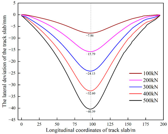 When the jacking loading length remains the same (jacking loading length of 5 slabs), the jacking force increases from 100 kN to 500 kN and the lateral deviation of the track structure also increases from about 7.86 mm to 40.39 mm, as shown in Figure 9. Therefore, the desired deviation can be achieved by adjusting the value of the jacking force (Figure 9) and the value of the jacking loading length (Figure 8).