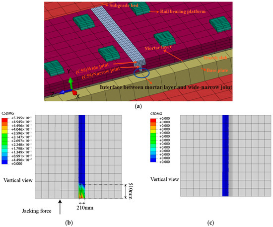 For the single point jacking rectification, the study shows that the contact between the track slab and wide-narrow joint is essentially the contact between the new and old concrete [23]. The interface between the mortar layer and the wide-narrow joint is more prone to damage (Figure 11), so this paper focuses on the interface damage between the mortar layer and the wide-narrow joint within the action of the jacking force. In this paper, the bond damage between mortar layer and the wide-narrow joint is analyzed by evaluating the bond damage in jacking rectification by the contact stiffness (CSDMG) of bond surface. The stiffness drop rate ranges from 0 to 1, when CSDMG = 1, it means that the bonding damage occurs in the interface (occurring crack), when CSDMG = 0, it means that the bonding damage does not occur. The bond performance between the mortar layer and the wide-narrow joint under a single point jacking force of 500 kN is shown in Figure 11.