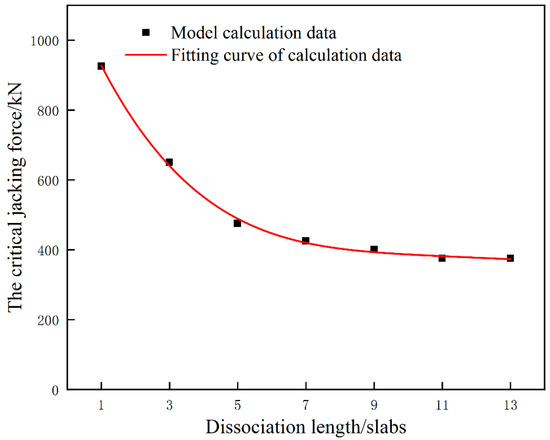 In order to analyze the influence of the dissociation length change on the critical jacking force, the corresponding critical jacking force is calculated under the condition of jacking loading length of 5 slabs when the dissociation length is 5 slabs, 7 slabs, 9 slabs, 11 slabs, 13 slabs, 15 slabs, 17 slabs and 19 slabs. The relationship between different dissociation lengths and the critical jacking force is shown in Figure 15. It can be seen from Figure 15 that the critical jacking force for avoiding damage of the interface between the mortar layer and the wide-narrow joint presents a nonlinear downward trend with the increase of the dissociation length. When the dissociation length is 17 slabs or above, the critical jacking force tends to a stable value, about 275 kN.