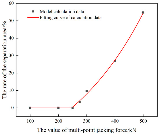 The ratio of the separated area to the total interface area when different jacking forces are applied under the condition of multi-point jacking.