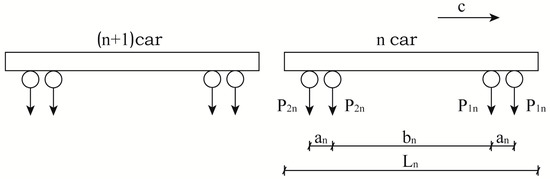 The continuous axle weight load generated by the train is shown in Equation (3) [33]: