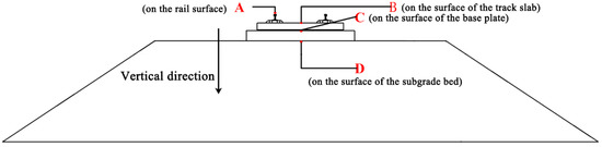 Monitoring points are set up at different locations in the model and the arrangement of each monitoring point is shown in Figure 17. Point A is the rail, point B is the surface of the track slab, point C is the surface of the base plate, point D is the surface of the subgrade bed.