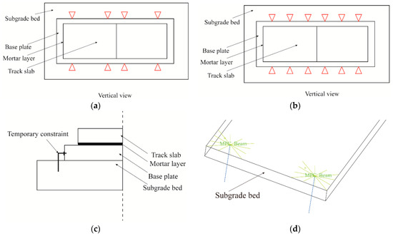 The rectification technology of the CRTS II slab ballastless track in the subgrade section is divided into two types [4,5,6]: mechanical rectification and grouting rectification. Mechanical rectification is mainly lifting the track by jack and then using the horizontal jack for lateral rectification of track slab, and finally fill polymer grouting material in the lifting gap; the implementation of grouting rectification technology relies on the reasonable arrangement of grouting lifting holes and grouting holes, releasing the constraint (dissociation) between the base plate and subgrade bed through temporary debonding agent, and then through lateral jacking to realize the rectification of track structure, as shown in Figure 1c. In order to ensure the safe operation of the train during the separation operation, temporary constraints are imposed between the base plate and the subgrade bed, as shown in Figure 1d. In Figure 1d, the temporary restraint is a temporary fixation of the track slab to the subgrade bed, restricts the horizontal displacement of the track slab that has been separated, and ensures the smoothness of the train operation line. After rectification, the dissociated interface between the base plate and the subgrade bed will be restored by grouting material.
