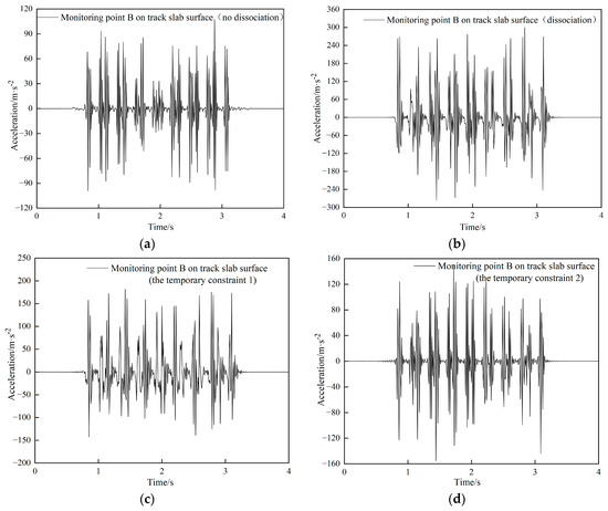 From Figure 20a–d, it can be known that the maximum value of the acceleration on the surface of the track slab is 105.6 m/s2 when the train is running at a certain speed under no-dissociation. The acceleration on the surface of the track slab under the dissociation condition increases significantly compared to the non-dissociation condition, up to a maximum of 308 m/s2. Under the dissociation condition, the acceleration on the surface of the track slab with the temporary restraint is significantly lower than that without the temporary restraint, and it can be seen that the magnitude of the acceleration on the surface of the track slab decreases significantly as more temporary restraints applied. The fluctuation range of acceleration on the surface of the track slab for the temporary restraint 1 condition is from 10.5 to 198.4 m/s2, and the maximum acceleration reduction on the surface of the track slab is about 36% compared to the simple dissociation condition without temporary restraint; the fluctuation range of acceleration on the surface of the track slab for the temporary restraint 2 condition is from 9.8 to 145.6 m/s2, and the maximum acceleration reduction on the surface of the track slab is about 53% compared to the simple dissociation condition without temporary restraint. The effect of temporary restraint 2 is good in terms of acceleration indicators.