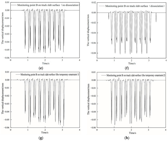 From the time-history curves of the vertical displacements in Figure 20e–h, it can be seen that the vertical displacement caused by the dissociation conditions is the largest under the four operating conditions, but the difference is small; The vertical displacements in the dissociated case with temporary restraint are similar to those of the non-dissociation case. The overall vertical displacement fluctuates between 0.05 and 0.08 mm for all four conditions, with the largest values occurring at the passage of the train axle load.