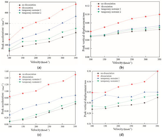 Figure 21 shows the variation of peak acceleration and peak displacement at the center of the track slab in the middle of the model and at the corresponding position of the subgrade bed surface at different train speeds for dissociation, non-dissociation, temporary constraint 1 and temporary constraint 2. The difference in peak acceleration for the same train speed between the dissociation and non-dissociation conditions is obvious. The corresponding acceleration and displacement response tend to decrease gradually as the temporary restraint is enhanced, with a significant decreasing effect on acceleration and displacement response after the temporary restraint 2 is applied. The acceleration on the surface of the track slab and the surface of the subgrade bed increases with the increase of train speed. During the jacking rectification fixing interval, it is necessary to discuss train speed limitation in order to ensure the safety of train running. According to the Technical Regulations for Dynamic Acceptance for High-speed Railways Construction TB 10761-2013 [9], the vibration acceleration of ballastless track slabs should be less than 300 m/s2 and the reference limitation value of vertical displacement in the slab is 0.2 mm. From Figure 21a it can be seen that the vibration acceleration of the track board exceeds 300 m/s2 at a train speed of 200 km/h (the dissociation condition), with temporary constraint 1 applied, the vibration acceleration of the track slab exceeds 300 m/s2 at a train speed of 300 km/h, and with temporary constraint 2 applied, the vibration acceleration of the track slab is within the standard limit when the train speed reaches 350 km/h. It can be seen that it is necessary to restrict the speed of the passing trains during the construction interval, which should be limited to no more than 150 km/h (with dissociation); when temporary restraint is applied, the travelling speed can be increased appropriately in conjunction with the actual situation.