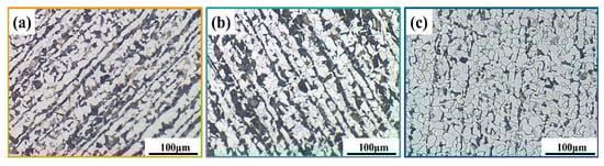 Figure 1 exhibits the microstructures of the three steel rebars. It can be seen that all samples consisted of pearlite (black) and ferrite (white), and there was obvious band tissue in the three steel rebars. Besides, the pearlite content of the base material (BM) (Figure 1a) and the Cr (Figure 1b) presented little differences, and that of the RE (Figure 1c) was lower than the other two steel rebars. This can be attributed to the influence of RE on the organization refinement. Due to the excellent physicochemical properties of RE and their oxides, including unique electron structure, outstanding chemical activity, and large ionic radius, RE can cause metamorphism, strengthening, and purification to improve the properties of steel [,,,]. In addition, with the decrease of the pearlite in the RE, the band-like structure in the steel rebar also significantly decreased. The previous study indicated that the RE element could reduce the activity of carbon in ferrite and increase the ability of ferrite to dissolve carbon, thereby changing the relative content of ferrite and pearlite [,]. Eventually, it could improve the comprehensive properties of steel rebars such as strength and plasticity. The obvious potential difference between the pearlite and the ferrite would provide a sufficient corrosion driving force, accelerating the corrosion process [,].