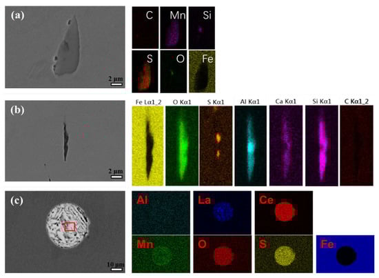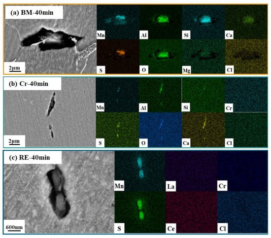 Observation and element distribution of inclusions in (a) BM, (b) Cr, and (c) RE steel rebars.