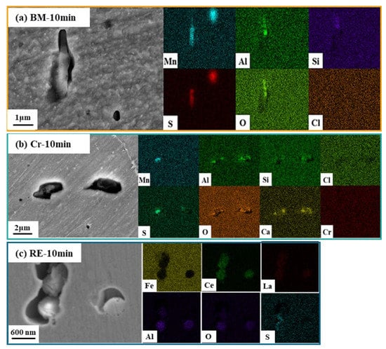 Figure 3 shows the surface morphologies and element distribution maps of the steel rebars after immersion in saturated Ca(OH)2 with 1 wt.% NaCl solution for 10 min. The corrosion pits initiated around the inclusions, which indicates the high-corrosion susceptibility of the area around the inclusions. Figure 3a reveals that the slender pit appeared on the surface of the BM. EDS results show the enrichment of Mn and S elements at the bottom of the corrosion pits. It can be speculated that the pits were formed on the MnS inclusions, which should be related to the chemical dissolution of MnS []. Due to the localized electrochemical property difference between MnS and the matrix, MnS with a lower Volta potential would dissolve preferentially [,]. As shown in Figure 3b, the size of the corrosion pits on the Cr rebar surface is similar to that in BM. Inclusions in the Cr rebar consist of MnO, MnS·Al2O3, CaO·MgO, and SiO2. Trace amounts of Ca, Mg, and Si elements were enriched in the corrosion pit. The corrosion pits on the surface of the RE bar were the smallest, with only the enrichment of Mn and S elements, which should be induced by MnS inclusions in the matrix. Thus, it can be deduced that RE can improve the corrosion properties of the MnS inclusion [,].