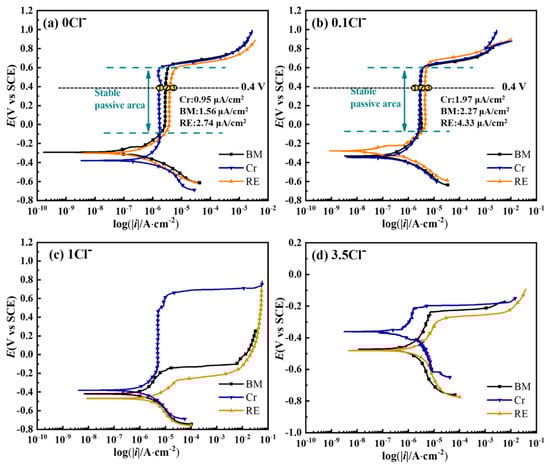 The typical cyclic potentiodynamic polarization results of three steel rebars subjected to four kinds of solutions with different Cl− contents are shown in Figure 6. It can be found that all cathodic polarization curves presented similar Tafel slopes, which were from −100 mV/decade to −120 mV/decade, indicating the water reduction dominating the cathodic reaction in the solutions with or without Cl− [,,]. Meanwhile, the anodic polarization curves of the three steel rebars showed different evolution trends in various environments. As for the blank environment (0 Cl−), all samples showed a stable passive area in the range of high overpotential, presenting different passive current densities. The left shift of the anodic polarization curve from BM to Cr suggests an enhanced resistance to corrosion by alloying Cr in the steel rebar []. The passive current density RE was higher than that of BM, illustrating a higher dissolution rate in the passive film with the addition of Cr and RE. With the increase of Cl−, an almost overlapped stable passive area was observed in the 0.1 Cl−, expect for a slightly increased passive current density of RE, illustrating little differences in passivation characteristics in this environment. Meanwhile, the stable passive area cannot be found in BM and RE, except for Cr in the 1 Cl−, which presented an activation process in the range of low overpotential. Furthermore, the activation process replaced the passivation process in the 3.5 Cl− for all steel rebars, which confirmed the destruction effect on the passive film of Cl− [,]. Based on the work in [,], the dissolution rate of passive film is directly related to the passive current density, and all current densities of steels rebars increase with the increase of Cl− content, indicating the promoting effects on the dissolution of the passivation film of Cl−. BM alloyed with Cr presented a better corrosion resistance than BM, which should be related to the participation of Cr-containing compounds in the formation of the passive film []. However, the simultaneous addition of RE and Cr elements had opposite effects on the stability of the passive film for BM. It has been reported that RE can modify the properties of inclusions relying on its activity in the steel [,], from which it can be inferred that the high activity of RE decreased the stability of the passive film. The increased Cl− content can significantly damage the stabilization of the passive film despite the addition of Cr in steel rebar, which can be confirmed by Figure 6d.