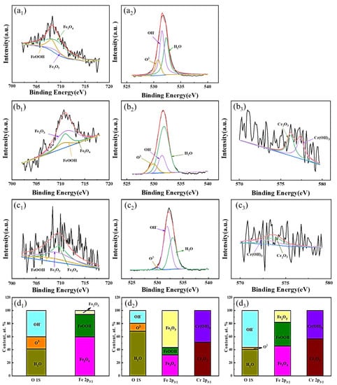 Further, the composition of the passive film after immersion in saturated Ca(OH)2 solution for 24 h was detected by the XPS test, as shown in Figure 7, which spontaneously reflects the stability and protectiveness of the passive film under the original state for the three steel rebars [,]. The forms of Fe, O, and Cr elements in the passive film were characterized, and the corresponding spectra were fitted based on the binding energy. The spectrum of Fe2p3/2 contains three constituent peaks, which can be divided into the FeOOH peak (711.9 ± 0.5 eV), the Fe3O4 peak (711.2 ± 0.2 eV), and the Fe2O3 peak (710.8 ± 0.1 eV). The spectrum of O1s is also split into three peaks, including O2− (529.8 ± 0.1 eV), OH− (531.2 ± 0.1 eV), and H2O (529.8 ± 0.1 eV) []. The spectrum of Cr 2p3/2 is composed of Cr2O3 (574.8 ± 0.1 eV) and Cr(OH)3 (577.4 ± 0.1 eV). In general, the higher the valence state of the metal element, the more difficult it is to continue to oxidize it [,]. The results show that Cr and Fe exist in the form of Cr3+, Fe2+, and Fe3+ in the passive film, respectively, which indicates the critical roles of Cr3+ and Fe3+ on the protectiveness of the passive film. The area integration of the peak represents the content of the compounds in the passive film, and the results can be seen in Figure 7d. As for Cr and RE steel rebars, the ratios of Cr2O3 and Cr(OH)3 are about 1, which suggests the weak effect of RE on the formation of Cr2O3 or Cr(OH)3) [,]. Meanwhile, the addition of RE decreased the ratio of Fe2O3/Fe3O4, which should be related to the high activity of RE on the formation of inclusions. Combined with Figure 5, though the properties of inclusions were modified by RE for the steel rebar, RE can be involved in the corrosion process and the formed corrosion products deposited at the bottom of the corrosion pits, confirming the high activity of RE []. Fe3O4 is considered as the mixture of FeO and Fe2O3, which contains Fe2+ and Fe3+, presenting a lower corrosion stability than Fe2O3 simply containing Fe3+ []. Thus, RE decreased the stability of the passive film for the Cr steel rebar.