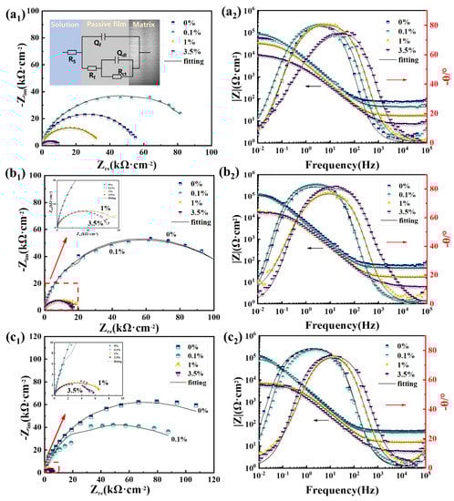 EIS plots of the passive film for (a) BM, (b) Cr, and (c) RE steel rebars in simulated solutions (1-Nyquist plots and 2-Bode plots). The equivalent electrical circuit for EIS data is inserted in (a1).