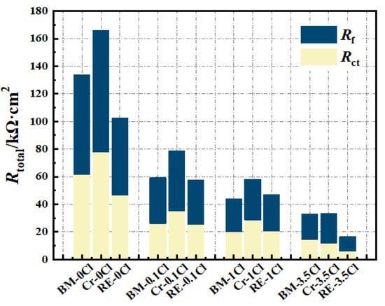 Figure 8 presents the EIS results of the three steel rebars in solutions containing different amounts of Cl−, which were fitted by the equivalent electrical circuit inserted in Figure 8(a1). All Nyquist curves of samples are composed of a large capacitance arc in all test environments, which are consistent with the two overlapping time constants shown in corresponding Bode plots. The equivalent electrical circuit used was determined based on the properties of the passive film in the high-frequency region and the charge transfer reaction process at the interface between the solution and the passive film in the low-frequency region. Thus, the whole electrode/film/electrolyte system of the steel rebars in the passive range can be divided into three impedances, including the electrolyte/passive film interface impedance, the passive film impedance, and the passive film/matrix impedance, and the fitting circuit can be expressed as: Rs(Qf(Rf(QdlRdl))). As for the parameters in the circuit, Rs is the solution resistance, Qf is the constant phase element (CPE) of the passive film for signifying the non-ideal capacitance, Rf is the resistance of the passive film, Qdl is the CPE of the double-electrode layer, and Rdl is the charge transfer resistance. The fitted results of EIS data can be seen in Table 1. Further, the sum value of Rf and Rdl was defined as Rtotal, and the results can be seen in Figure 9. It can be found that the Rtotal of the Cr steel rebar was the highest among the three steels, suggesting the increase of the passive film corrosion protectiveness and the increase of the charge transfer resistance by the addition of Cr in BM. Meanwhile, adding Cr and RE at the same time, the impedance of the steel rebar presented a similar level as the BM in different solutions containing Cl−. To be more specific, Rdl dominates the decrease of Rtotal, indicating the promotion of RE on the charge transfer process. The thickness can reflect the protectiveness of the passive film, which can be obtained from the following formulas based on previous studies [,]: