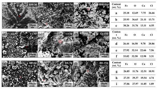 For characterizing the local micromorphology, the rust after dry/wet cyclic tests was observed by SEM, as shown in Figure 10. In the early stages of corrosion, i.e., after 3 days of dry/wet cyclic tests, a loose rust layer consisting of a granular structure and a lamellar structure was formed on the surface of BM and Cr steel rebars. The rust layer on the surface of the RE steel rebars contained only granular structures, and elemental analysis revealed that the granular structure had a low Cl content, while the lamellar structure had a high Cl content, as shown in Figure 10a,d,g. As the corrosion time increased, the rust layer of the three steel rebars transformed into a lumpy structure. After 7 days of dry/wet cyclic tests, a dense rust layer was formed on the surface of the three steel rebars. Elemental analysis revealed that the RE rebar had the lowest Cl content in the rust layer, followed by Cr steel rebars, while BM steel rebars had the highest Cl content in the rust layer. After 15 days of dry/wet cyclic tests, similar to the 7-day results, the BM steel rebar still had the highest Cl content in the rust layer, the Cr steel rebar the next, and the RE rebar the lowest. At the same time, it can be found that the rust layer of the BM steel rebar had a large number of cracks in the block structure, the rust layer of the Cr steel rebar also had a few continuous cracks on the surface, while the rust layer of the RE rebar was dense and had the least cracks.