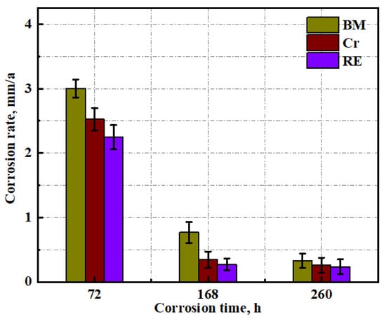 The corrosion rate results can be seen in Figure 11. As the corrosion time increased, the corrosion rate decreased for the three steel rebars, which was related to the increased protectiveness of the rust layer. At the initial stage of corrosion, i.e., at 3 days of dry/wet cyclic tests, the three steel rebars exhibited high corrosion rates, which was because no rust layer with a dense structure had been formed on the surface of the three steel rebars at this time. At this point, the corrosion rate of the RE rebar was the lowest, followed by Cr, which is consistent with the above results. After 7 days of dry/wet cyclic tests, the rust layer with a dense structure was formed, and the corrosion rate of the three steel rebars showed a significant reduction. At this point, the RE rebar still had the lowest corrosion rate and Cr the second lowest, which combined with the analysis of Cl content on the surface of the rust layer in the previous section, suggests that the rust layer of the RE rebar had the best protection when a stable rust layer first started to form. After 15 days of dry/wet cyclic tests, as the progress of corrosion progressed, the corrosion rate of the three steel rebars continued to decrease, indicating that the structure of the rust layer became denser. At this time, RE still had the lowest corrosion rate, followed by Cr, suggesting that Cr and RE act on the rust layer to further improve the protective properties of the already dense structure.