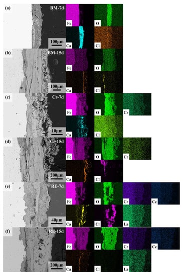 For discussing the functions of Cr and RE on the rust layer’s protectiveness, the cross-sectional morphologies and element distribution mappings were characterized and presented in Figure 12. As the rust layer after 3 days was heterogeneous and thin, the rust layers after 7 and 15 days were chosen and further analyzed. For the rust layer after 7 days, the rust layers of the Cr and the RE rebars formed a layered structure containing the outer rust layer and the inner rust layer. In contrast, the rust layer of BM still did not form a dense inner rust layer. Thus, in the elemental analysis, it can be found that the rust layer of BM was entered and enriched with a large amount of Ca from the environment, whereas in the rust layers of Cr and RE, Ca was mainly concentrated in the outer rust layer and was present a low content. A large amount of Cl could be found in the rust layer of BM and an enriched zone of Cl was present at the interface between the rust layer and the substrate. No enriched zone was found in the rust layer of Cr, and the Cr enrichment zone was observed in the inner rust layer, but significant amounts of Cl were still present. In the case of RE, similar to Cr, the enriched zone of Cr in the inner rust layer was also observed, while La and Ce were diffusely distributed throughout the rust layer. Cl was enriched in the outer rust layer, which indicates that the rust layer had good protective properties [,].