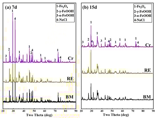 To obtain the phase composition of the three steel rebars after the dry/wet cyclic tests, the XRD results of 7 and 15 days are presented in Figure 13. In both corrosion cycles, the crystalline phase of the rust layer consisted of α-FeOOH, γ-FeOOH, and Fe3O4 [,]. There was not a significant difference in the physical phase, which should be related to the low addition of alloying elements, while the intensity of the α-FeOOH increased with the addition of Cr and RE, which indicates that Cr and RE promoted the formation of α-FeOOH. Comparing the intensity and the integral area of the physical phase, it can be roughly seen that the highest levels of Fe3O4 were found over the whole corrosion process, which should be attributed to the inadequate oxidation reaction during the dry/wet corrosion test. By comparing the results at 7 and 15 days, it can be found that the content of α-FeOOH increased with the corrosion cycles, which was in contrast to the content of γ-FeOOH, indicating that the compactness of the rust layer densified with the corrosion cycles. Compared with the 7- and 15-day XRD results, it can be found that the addition of RE in the Cr rebar decreased the intensity of the Fe3O4 peaks (2θ = 71–75°), suggesting the inhibition on the formation of Fe2+. Combined with the results in Figure 12, it can be concluded that RE can block the invasion of Cl− and promote the formation of the stabilized substance in the rust layer, which increases the protectiveness of the rust layer.