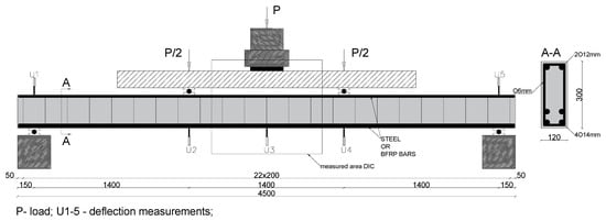 Six concrete beams with a cross section of 120 × 300 mm and a length of 4500 mm were tested. They were designed with different longitudinal and shear reinforcements and with different contents of basalt fibers in the concrete mix. Table 1 presents the details of the parameters of the tested beams.