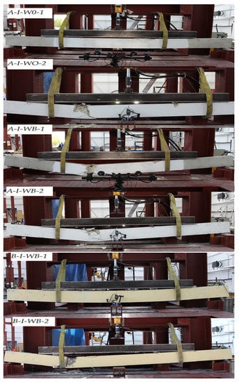 In line with the assumptions, the beams failed at bending (Figure 3). All the beams showed a similar pattern of failure, i.e., the crushing of concrete in the compression zone. One of the beams in series B-I-WB1 achieved the highest deflection, which resulted from its leaning against the belts and thus changing the static pattern of the beam (the test was discontinued at that point). The beams with composite reinforcement were characterized by the greatest number of cracks with the largest crack width. The use of basalt fibers resulted in slightly reduced scratching of the beam’s cross section.