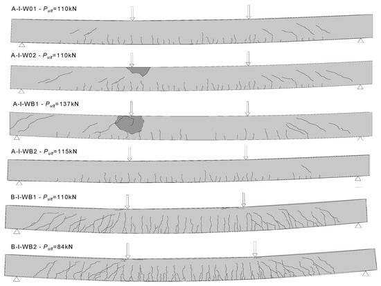 The cracking patterns for the eight RC beams are shown in Figure 4. In the case of BFRC RC beams, the first perpendicular crack developed at 0.1 Pult. The first vertical flexural crack in BFRC RC beams was initiated in the middle of the constant moment region. The diagonal cracks formed when a load of approximately 0.5 Pult was applied. The first perpendicular cracks in RC and FRC reference beams developed when a load of 0.2 Pult was applied. Diagonal cracks formed much later in RC (0.45 Pult—A-I-W01, 0.45 Pult—A-I-W02) and FRC (0.60 Pult—A-I-W01, 0.52 Pult—A-I-W02) beams. This means that beams with steel reinforcement and basalt fibers had the highest scratch resistance. BFRC RC beams showed the lowest scratch resistance.