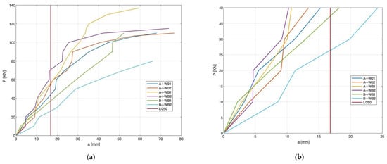 Load-deflection curves for the tested beams. (a) Relationship until ultimate deflection; (b) Relationship between the development of the first crack and deflection limits.