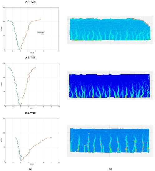 Strains in concrete in series A-I-W01, A-I-WB1, and B-I-WB1. (a) The position of longitudinal reinforcement in tension and compression zones; (b) Strains in the DIC area.