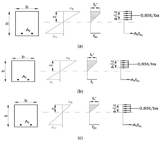 Three operating states of the structure with BFRP reinforcement: (a) cross section with the optimal degree of reinforcement, (b) rearmed cross section—failure by the crushing of concrete, (c) underreinforced cross section—failure by bars breaking.