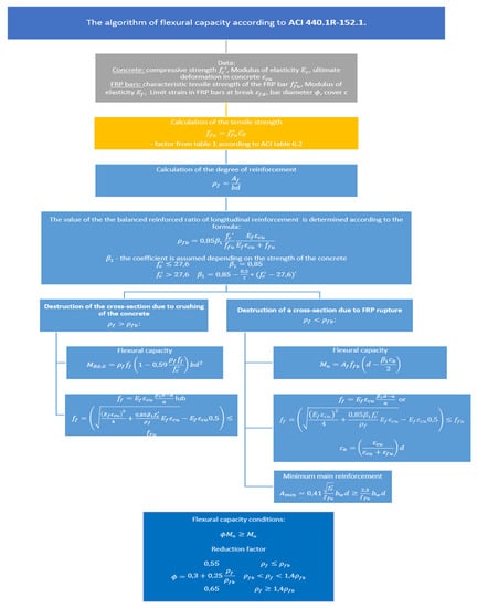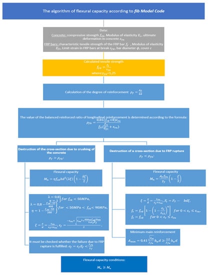 Flexural capacity depends on the compressive strength of the concrete, the amount of FRP reinforcement, and its strength. In the case of the fib Model Code [], it also depends on the extent of the compression zone in the concrete. The differences in the magnitude of the flexural capacity depend on the following: