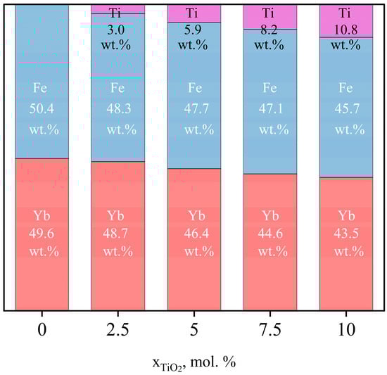 The energy-dispersive X-ray spectroscopy (EDXS) results (Figure 1) demonstrate that, for all samples, the Yb: Fe ratio is approximately equal to 1. In the samples containing titanium dioxide, its amount corresponds to the values declared during the synthesis. Thus, the planned ratios of key elements are achieved within the error of the determination.