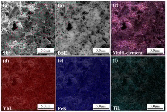 SEM images obtained on SE (a) and BSE (b) detectors and EDXS multi-element (c) and single element (d–Yb, e–Fe, f–Ti) mapping of a sample containing 5 mol.% of TiO2.