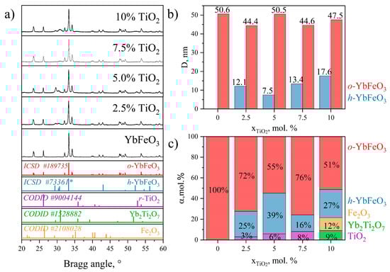 Figure 3a demonstrates the PXRD patterns measured at room temperature with ground samples after heat-treatment at 800 °C. All peaks of YbFeO3 can be well-indexed to the characteristic XRD peaks of the orthorhombic structure according to the ICSD card No. 189735. The absence of any additional peaks indicates the successful synthesis of pure o-YbFeO3 by the solution combustion method. For all the samples synthesized with the addition of TiO2, the presence of h-YbFeO3 is observed. For samples containing from 2.5 to 7.5 mol.% of TiO2, only o-YbFeO3, h-YbFeO3, and r-TiO2 phases can be indicated. There were no other peaks related to impurities for these samples. A further increase in the mole fraction of titanium dioxide leads to the formation of a mixture of phases o-YbFeO3, h-YbFeO3, Yb2Ti2O7, and Fe2O3.