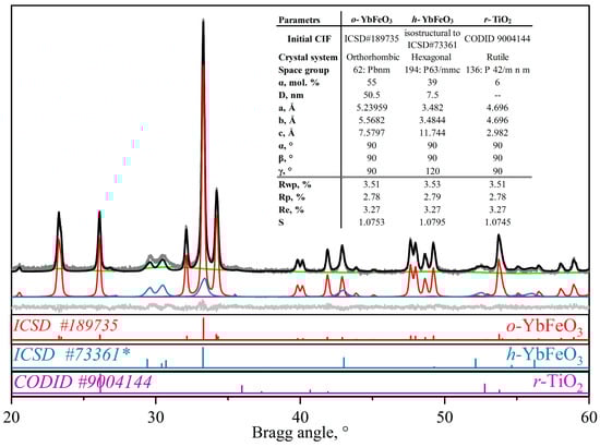 The degree of conversion dependences in Figure 3c were evaluated by the Rietveld refinement method. Structural parameters and criteria of fit of the typical refinement for the sample containing 5 mol.% of TiO2 are presented in Figure 4. The refinement data confirms that the o-YbFeO3/h-YbFeO3/r-TiO2–5% sample consist of three phases: o-YbFeO3 with orthorhombic structure, space group Pbnm; h-YbFeO3 with hexagonal structure, space group P63/mmc; r-TiO2 with rutile structure, and space group P 42/m n m. The investigated unit cell parameters are in good agreement with literature data. The value of Rwp, Rp, and Re parameters show that the refinements were correct.