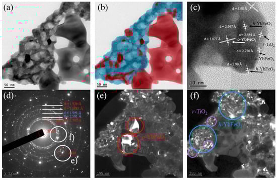 TEM images of the h-YbFeO3/o-YbFeO3/TiO2–5% sample: (a) an overview of the o-YbFeO3/h-YbFeO3/TiO2 nanocomposite, (b) color designation of phases: red—o-YbFeO3, blue—h-YbFeO3, purple—r-TiO2, (c) the h-YbFeO3 to o-YbFeO3 and to r-TiO2 heterojunction, (d) selected area transmission electron diffraction (SAED) pattern and dark-field TEM of o-YbFeO3 (e) and h-YbFeO3, r-TiO2 (f) nanocrystals.