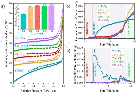 For a more detailed study of the specific surface area, average pore size, and volume of the obtained nanopowders, an adsorption structural analysis was performed using a low-temperature adsorption–desorption of nitrogen (77 K). Figure 6 presents the results of the experiment. As can be noticed from Figure 6a, the N2 adsorption–desorption isotherm obtained for YbFeO3 presented the type II isotherm with H3 hysteresis loop, and the classical type IV isotherm with H4 hysteresis loop was obtained for other samples containing TiO2. The change in the isotherm type and the form of the loop results from the appearance of h-YbFeO3 in the samples [].